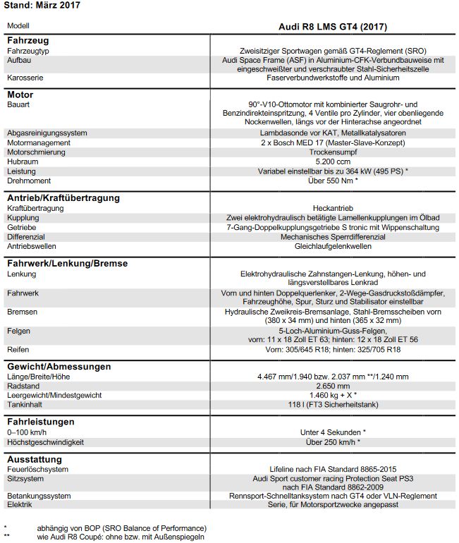 Audi Sport entwickelt das je nach Einstufung bis zu 364 kW (495 PS) starke GT4-Modell im Lauf der Saison 2017, bevor ein finaler Homologationsstand erreicht ist und die Sportzulassung beantragt wird. In der zweiten Jahreshälfte bereitet das Team von Chris Reinke, Leiter Audi Sport customer racing, die Produktion des Rennwagens vor. So können die ersten Kunden den neuen Audi R8 LMS GT4 ab Jahresende entgegennehmen.
