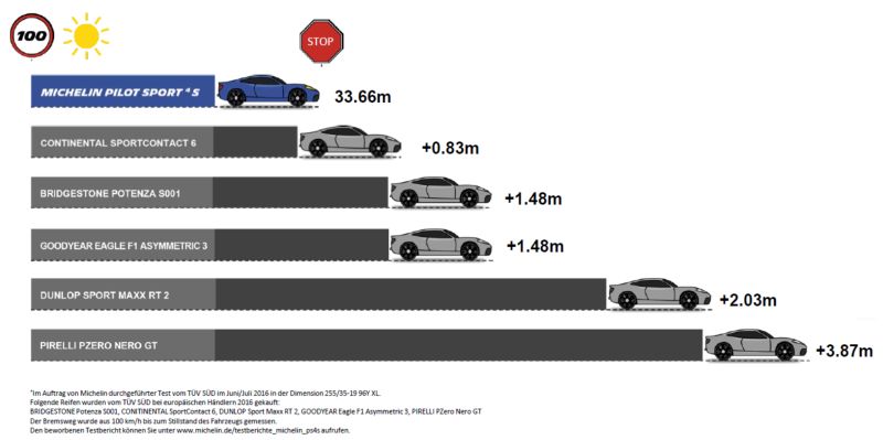 Über die hohe Performance des neuen Reifens konnten wir uns Ende Januar selbst überzeugen: Im Rahmen der internationalen Presse-Präsentation ließ Michelin den Pilot Sport 4 S unter anderem gegen die Produkte des Wettbewerbs antreten. Auf dem engen Handlingskurs war der neue Michelin-Pneu nicht nur subjektiv der Reifen, der am meisten Grip und das beste Einlenkverhalten bot. Der Eindruck wurde auch objektiv bestätigt, denn alle Rundenzeiten und Bremsergebnisse der Journalisten wurden protokolliert. Am Ende des Tages zeichneten die gesammelten Daten ein klares Bild: Der Michelin Pilot Sport 4 S war in den genannten Disziplinen allen Produkten der Konkurrenz überlegen.