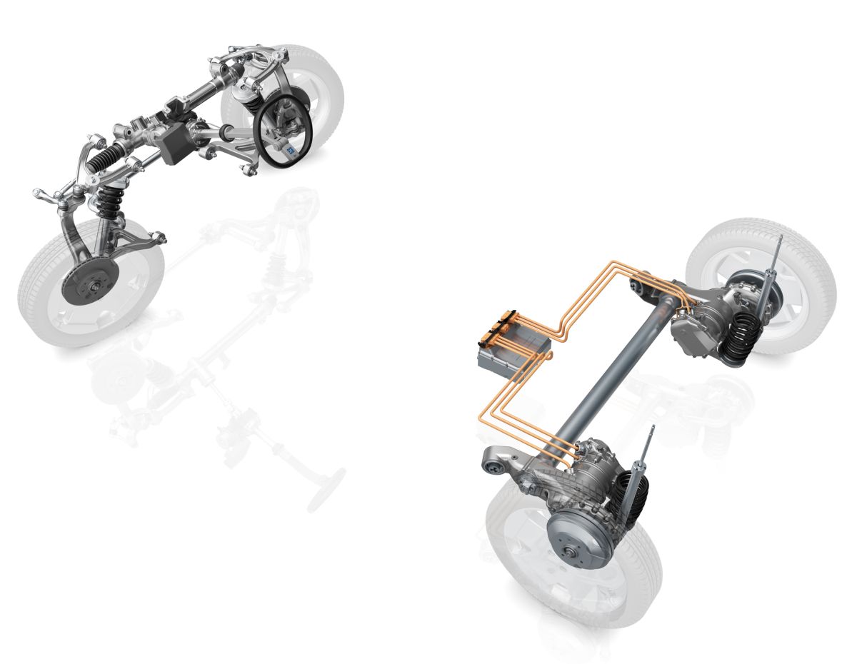 Die IRC-Vorderachse basiert auf einer innovativ konstruierten Doppel-Querlenker Einzelradaufhängung. Sie ist die zentrale mechanische Voraussetzung, um den Lenkwinkel im Zusammenspiel mit der elektromechanischen Lenkung auf bis zu 75 Grad zu erhöhen. Wende- und Einparkmanöver gelingen dank des extrem hohen Radeinschlags spielerisch.