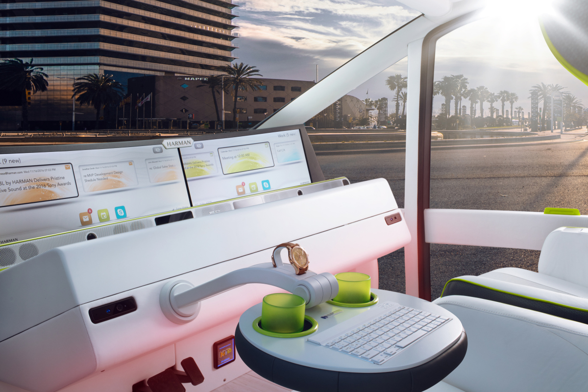 Damit ist die Voraussetzung für ein weiteres einzigartiges Lenkrad-Feature gegeben, das ZF speziell für den automatisierten Fahrmodus im Oasis entwickelt hat: Solange der Computer steuert, lässt sich das Hightech-Volant wie ein Klapptisch umlegen und arretieren. In diese Fläche kann anschließend ein Tablet-PC, eine Tastatur oder eine maßgeschneiderte Ablage eingeklickt werden. Der Fahrerairbag befindet sich konsequenterweise nicht länger im Lenkrad, sondern ist für den Einbau im Dachhimmel oberhalb der Windschutzscheibe vorgesehen.