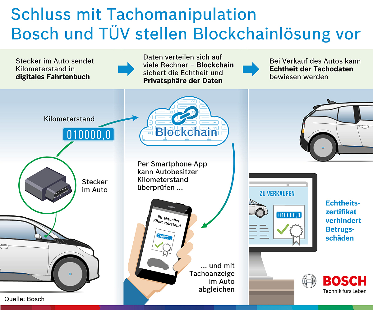Wie sich Blockchain in der Praxis einsetzen lassen könnte, zeigte der Bosch-Chef in Kooperation mit dem TÜV Rheinland in einer Live-Demonstration. Dem weitverbreiteten Tacho-Schwindel ließe sich damit ein Ende setzen. Rund sechs Milliarden Euro Schaden verursachen manipulierte Kilometerzähler in Fahrzeugen allein in Deutschland. Verhindern soll den Tacho-Betrug ein digitales Fahrtenbuch, das sich auf viele Rechner verteilt. Über einen einfachen Stecker sendet das Auto regelmäßig den Tachostand auf die verschiedenen Rechner. Per Smartphone-App kann der Autobesitzer jederzeit den echten Kilometerstand überprüfen und mit der Tachoanzeige im Auto abgleichen. Wenn er das Auto verkaufen möchte, lässt sich ein Zertifikat erstellen, das dem Käufer die Echtheit der Tachodaten beweist. Es ist auch möglich, das Zertifikat über das Internet zu teilen, beispielsweise auf Online-Verkaufsplattformen für Autos.