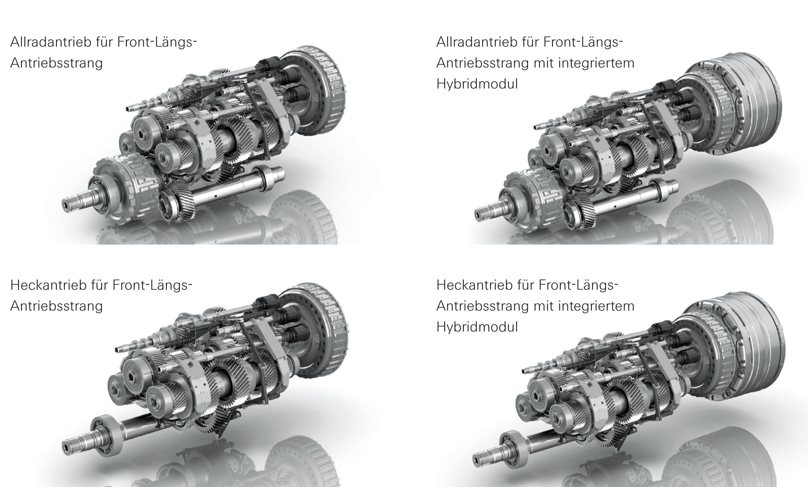 Das neue 8-Gang-Doppelkupplungsgetriebe steht für Front-Längs-Konfiguration in vier unterschiedlichen Varianten (Standard, Allrad, Hybrid, Allrad-Hybrid) in jeweils drei Drehmomentklassen bis maximal 1.000 Nm bereit. Die Drehmomentklasse definiert sich dabei über unterschiedlich ausgelegte Doppelkupplungsmodule, das Grundgetriebe samt Radsatz bleibt stets unverändert. Dies gilt auch für die Getriebehydraulik, das Schaltungssystem, die Parksperre sowie das elektronische Steuergerät samt Software.