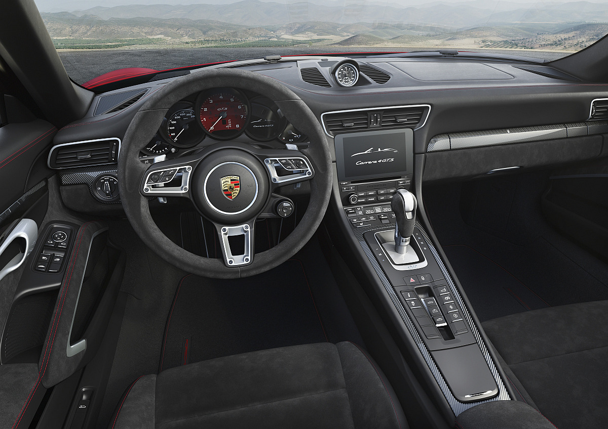 GTS-Gene bestimmen auch das Interieur. Die Stoppuhr des serienmäßigen Sport Chrono-Pakets ist zentral in der Armaturentafel integriert. Speziell für den Marktstart der GTS-Modelle weiterentwickelt, präsentiert sich die Porsche Track Precision App. Sie erlaubt unter anderem die automatische Aufzeichnung, detaillierte Anzeige und Analyse von Fahrdaten auf dem Smartphone.