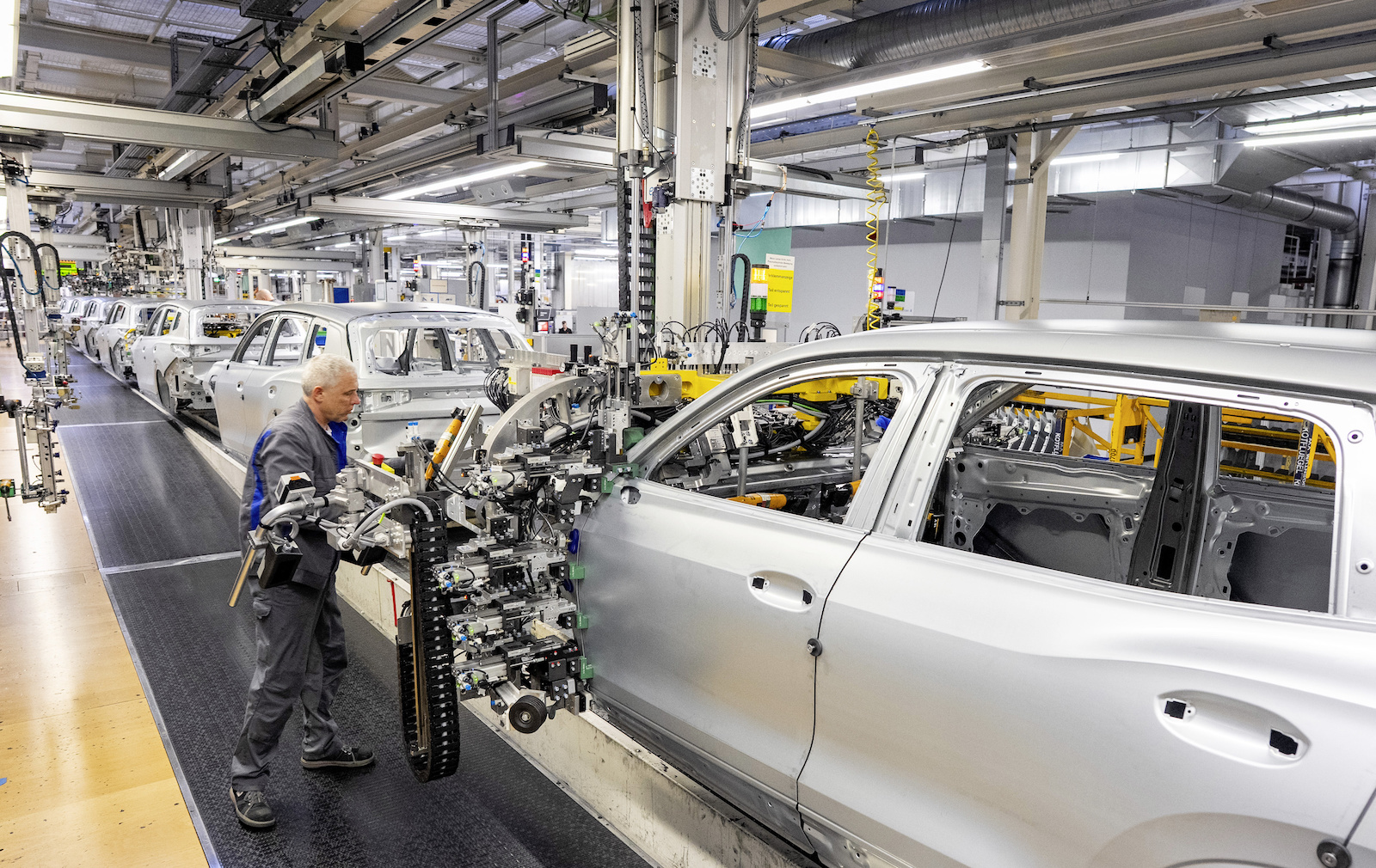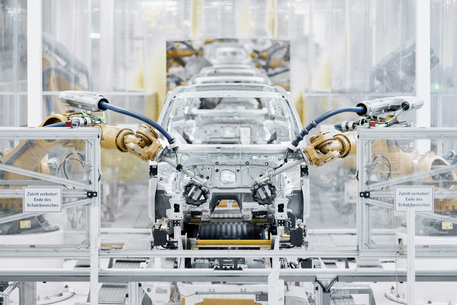 Die Wertschöpfung beginnt im Presswerk, in dem Stahl- und Aluminiumcoils unter mehrstufigen Pressvorgängen in Strukturbauteile transformiert werden. Diese Bauteile durchlaufen anschließend den Karosseriebau, in dem hochautomatisierte Roboteranlagen Schweißpunkte setzen, Strukturteile fügen und Toleranzen im Submillimeterbereich überwachen. Digitale Messsysteme, kamerabasierte Prüftechnik und adaptives Fügen gewährleisten eine reproduzierbare Qualität über hohe Stückzahlen hinweg.